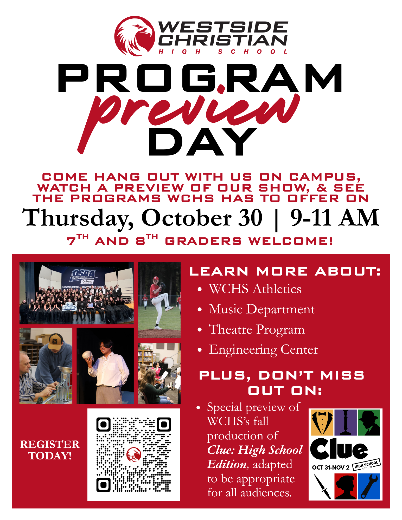 Students will check in at 9 am and pick up will be at 11:00 am. This time has been created to give students a glimpse into some of the opportunities Westside has to offer. Students will spend the first hour watching Clue, our Fall Play. They will then meet the Head of School, the Athletic Director, and tour our newly renovated Eagle Engineering Center.